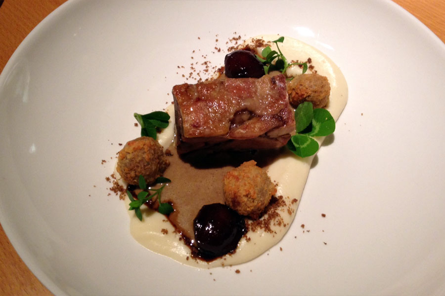 Jako předkrm jsme mimo jiné zvolili pečeného holuba z Anjou, který byl výtečně a netradičně dochucen (ovoce + drcené kakaové boby). Jako hlavní chod nás zaujala kachna, jednalo se o různé kousky kachny umně spojené do jedné teriny, podáváno s houbovou omáčkou a různě upravenými vnitřnostmi. Tento chod mě hodně zaujal, a dal bych si ho určitě znovu.