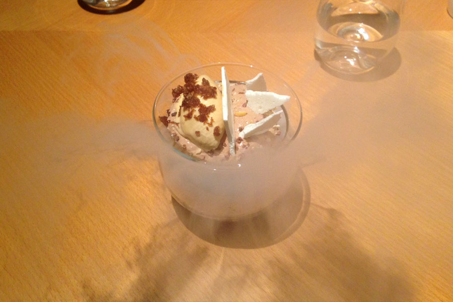 Z dezertů jsme zvolili Espressovou pěnu, vtipně podávanou na suchém ledu zalitém kávou, což vyvolalo okamžitou chemickou reakci a všichni jsme se na chvíli ocitli v mlze. Efektní. Výběr dezertů mi přišel slabší, orientovaný spíše na dospělou klientelu, dcera si nemohla vybrat :-).