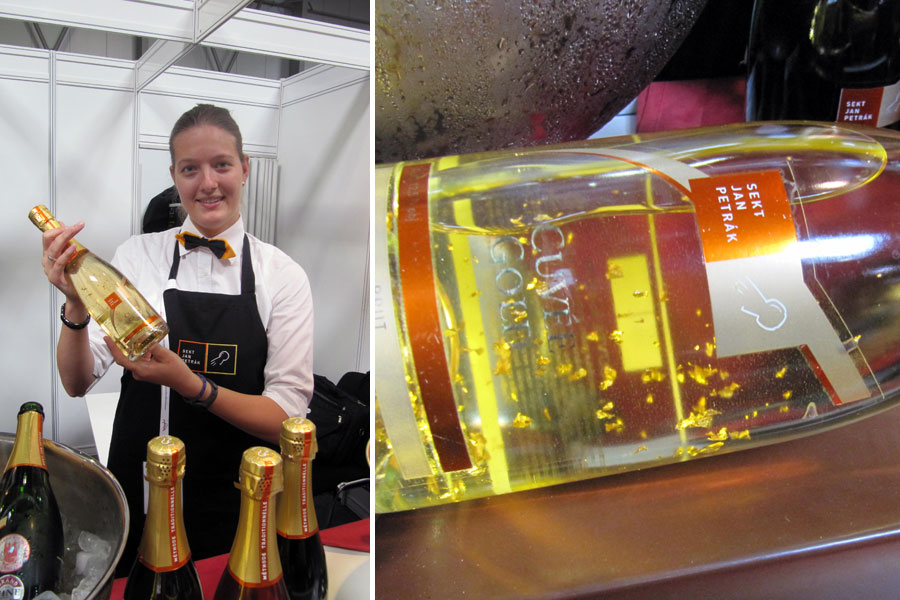 Moc se mi líbil sekt Cuvée Gold 2008 (viz foto 4) z ryzlinku, který ležel 5 let na kalech, od vinařství Sekt Jan Petrák. Ve speciální edici v něm plavou šupinky zlata, které bych si odpustil, ale samotný chuťový projev je báječný.