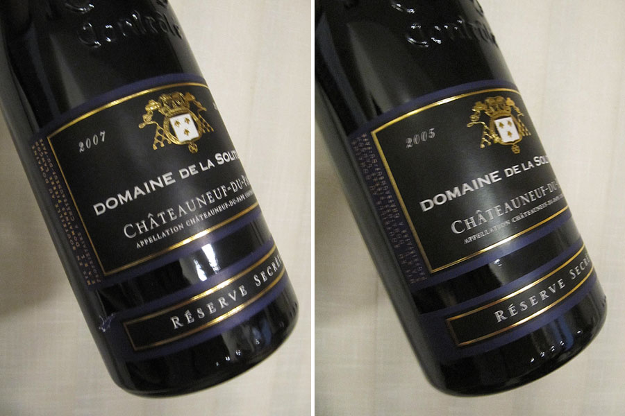 Châteauneuf du Pape „Réserve Secrète“, AOC Rouge, 2005 (foto 6b)Od vůně lehce nazrálé, takové „zamlžené“, jinak srovnané, spíše do červených plodů, sud, bylinky. Chuť navazuje, ale méně ovoce a více zemitosti a dřeva. V těle střední až plnější, s výraznými ovocně-zemitými taniny a dlouhou perzistencí.