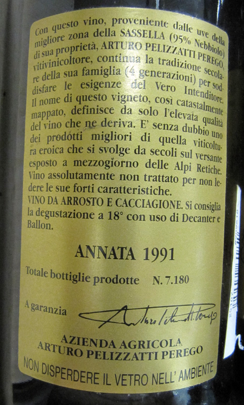 Ještě zajímavějším setem byla tři vína Sassella Vigna Regina, Riserva v ročnících 2001, 1999 a 1991. Jaký bude po 22 letech od sklizně ročník 1991, který se určitě ve valtellinských memoárech nevyjímá jako vydařený (z pohledu podmínek na vinici)? První dvě „Reginy“ naplňují svou pověst beze zbytku. Svěží, plná, noblesní vína s pevnou a přesnou strukturou, harmonická, s hladkými vyzrálými taniny a dlouhou až velmi dlouhou perzistencí, minerálně-ovocná (třešňový kompot) s tóny mléčného karamelu, čaje a půdy.
