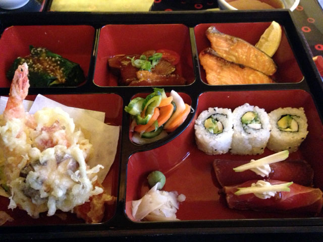 Tradiční japonské. K obědu jsme vybrali Miyabi sumo obentó. Velmi dobré krevety v tempuře, skvělý losos, vynikající kachní prsa ve sladké omáčce a fenomenální nigiri z tuňáka (puraha nigiri), které patřilo k jednomu z nejlepších japonských jídel, která jsem kdy měl příležitost ochutnat. Kvalita ryby byla ohromující.