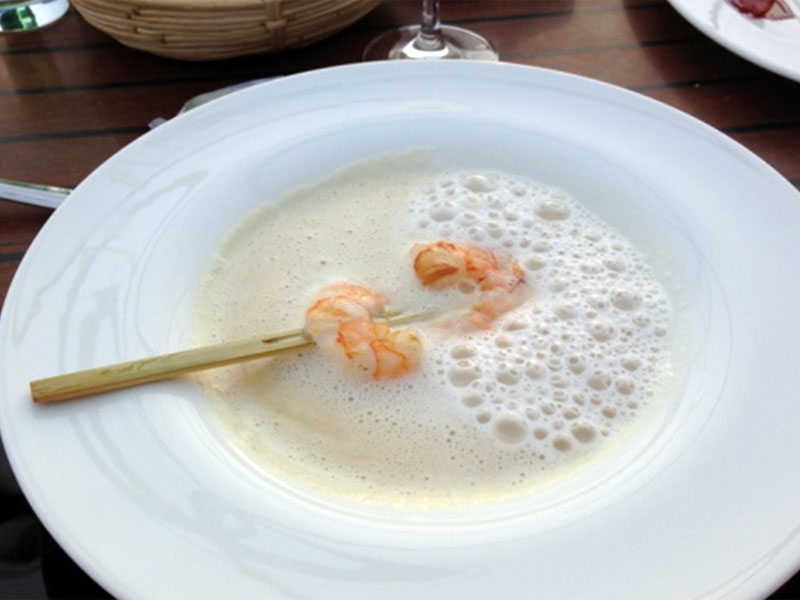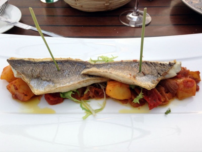 Restaurace má na lístku převážně jídla inspirovaná asijskou a blízkovýchodní kuchyní, částečně pak také lokální jídla (ryby a vídeňský řízek). Jako předkrm jsme měli velmi povedenou thajskou polévku s krevetami, hlavním chodem byl pstruh s rajčaty a fenyklem, dezertem pak famózní krém z bílé čokolády se skvělým jahodovým sorbetem.