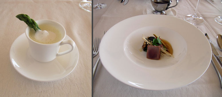 Vynikající je jemný chřestový krém s mléčnou pěnou podávaný v kávovém šálku s kouskem zeleného chřestu, božskou kombinací pak mléčné telecí „sous vide“ s čerstvými smrži a la créme, zeleným chřestem a domácími špagetami doprovázené Pinot Noir „Ben’s Reserve“ 2011 od Springer-Stapleton, pro mě subjektivní vrchol hlavních jídel.