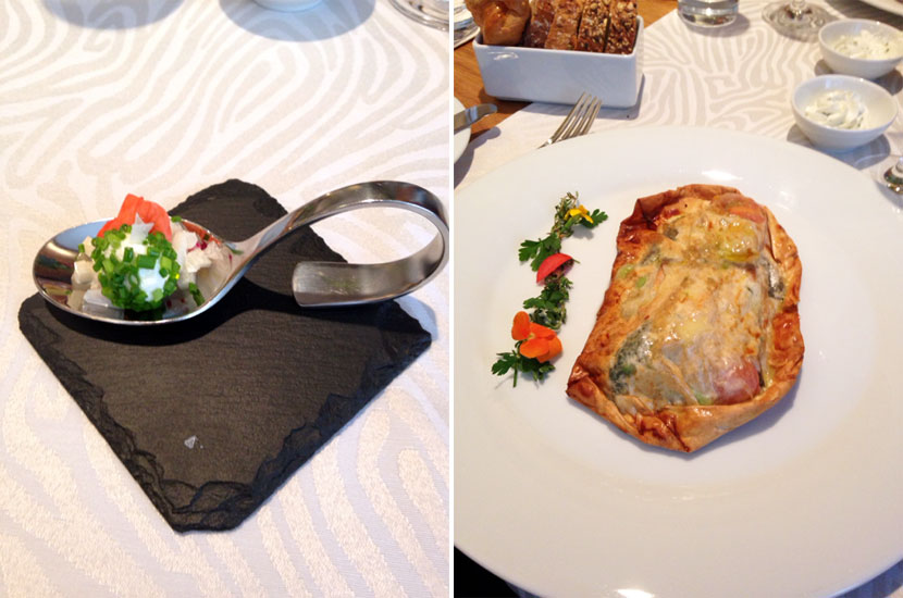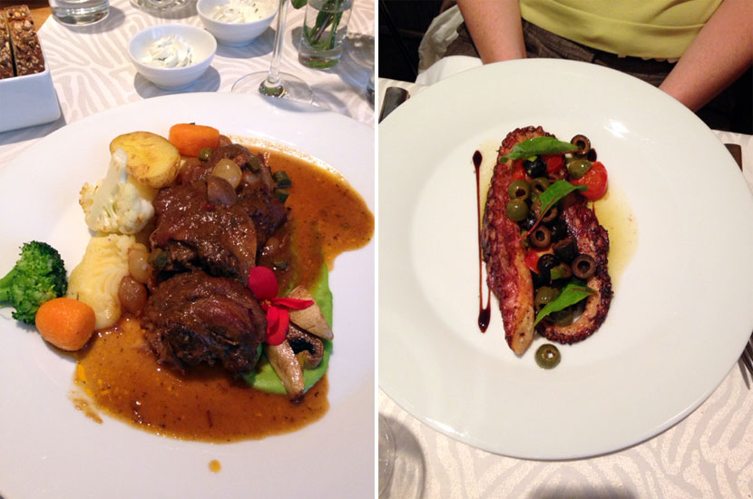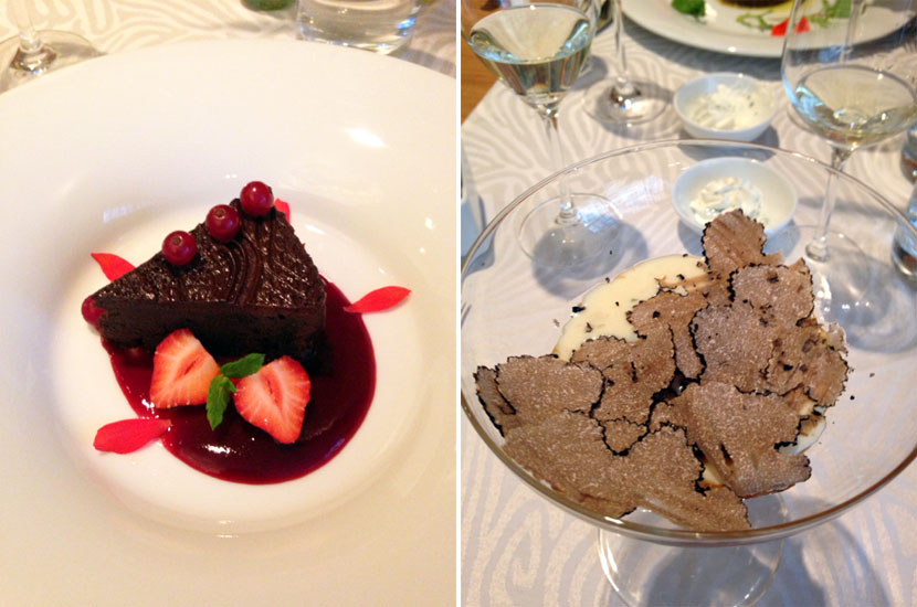 Na jídelním lístku je několik položek, které jsou doplňovány o sezónní speciality. My jsme si vybrali vejce pošírované při 63 °C s čerstvě nastrouhaným černým lanýžem z Piemontu, jako další chody jsme ochutnali kohouta na víně a hovězí po Burgundsku. Obojí ve skvělé kvalitě, velmi dobře zpracované. Jako dezert jsme si dali čokoládový dortík a créme brulée, které nás překvapilo svou jemností. Jeden z nejlepších, jaký jsem kdy ochutnal.