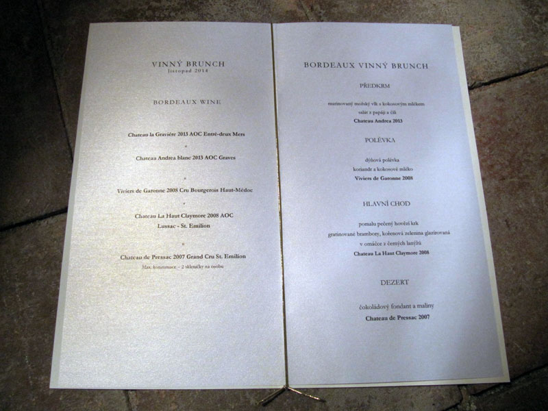 Vinný brunch probíhal stylem představování jednotlivých vín, o kterých hovořil Dominique Pilou, doplňovaných komentáři Martina Grmolce a Martina Marka ze společnosti Vins de France. Moc se mi líbilo uvolněné a přirozené plynutí celé akce, kdy skleničky hostů byly stále naplněné a zároveň nikdo neměl pocit spěchu. Vždy jeden dva vzorky s komentářem a ochutnáním, následované chodem jídla s vybraným vínem.