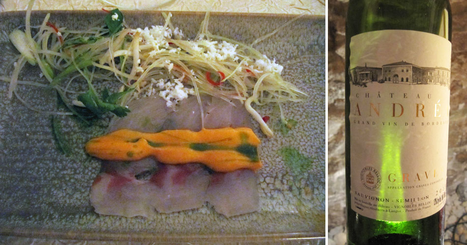 Jako první chod byl podáván marinovaný mořský vlk s kokosovým mlékem se salátem z papáji a chilli společně s Château Andréa 2013 (60 % Sémillon, 40 % Sauvignon blanc) z Graves. Víno samotné není příliš výrazné, působí spíše zastřeně a poměrně striktně, má lehce plnější tělo a střední perzistenci s citrusově-hořčinkovou dochutí. V kombinaci s vybraným jídlem ale neskutečně ožívá a stává se právoplatnou polovicí zážitku. I vynecháním jediné ze složek pokrmu přichází člověk o dokonalost chuťového vjemu. Klobouk dolů za parádní kombinaci.