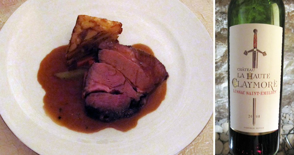Hlavní chod obstaral pomalu pečený hovězí krk s gratinovaným bramborem a kořenovou zeleninou glazírovanou v omáčce z černých lanýžů v páru s Château La Haute Claymore 2008 (70 % Merlot, 20 % Cabernet Franc, 10 % Cabernet) z Lussac-St. Émilion. Víno je plnější, ovocné (do tmavých plodů), s náznakem mléčného karamelu, má citelné vyzrálé ovocné taniny, propracovanější strukturu než předešlá vína, a delší perzistenci. Kombinace s celým chodem výborná, gratinovaný brambor excelentní. Malou výhradu mám ke konzistenci masa, které bych si představoval šťavnatější a jemnější.