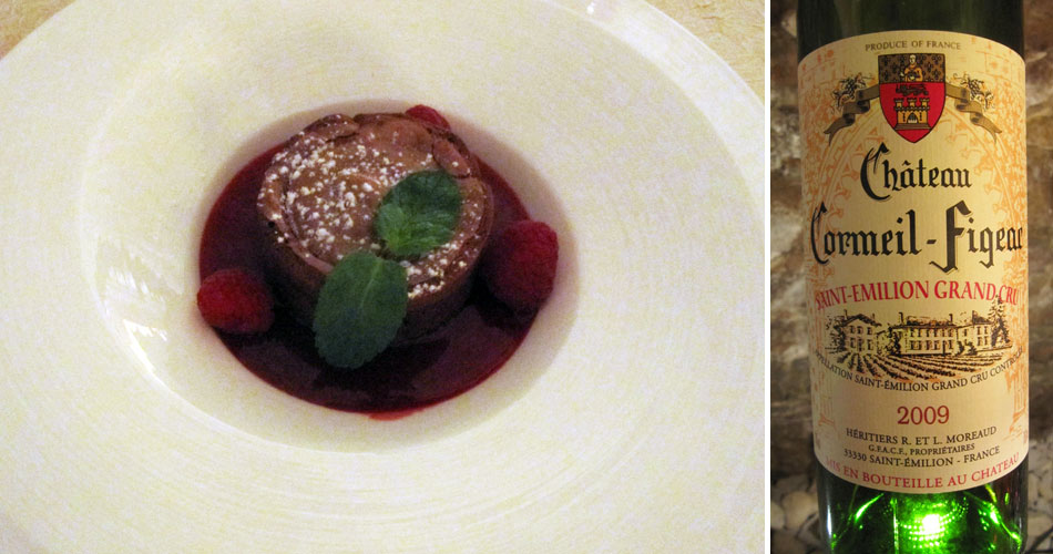 Čokoládový fondant a maliny. Už jen ten název má na mě magnetický účinek. A v kombinaci s vhodným červeným vínem? Kdo jednou ochutnal, ví navždy. Château Cormeil-Figeac, Grand Cru, 2009 (70 % Merlot, 30 % Cabernet Franc) ze St. Émilionu je víno zábavné samo o sobě. Harmonické, s chuťovým profilem malin a švestek, jemnou mineralita, šťavnatostí, velmi dobrou strukturou, plnějším tělem a delší až dlouhou perzistencí. Spojení obou je krásné, ikdyž trochu jinak než třeba u předkrmu. Dvě silné osobnosti tvořící pár. Symbolické…