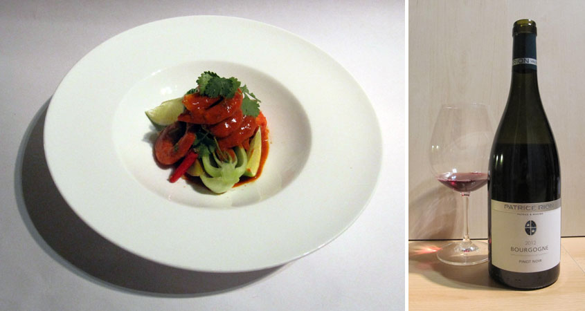 To splynutí nám vyrazilo dech. Dokonalá kombinace citrusů a hlavně mandarinek, výrazné minerality a opulentnosti. Ještě štěstí, že jsme na začátku rozdělili krevety na tři stejné hromádky, jinak by asi třetí chod vůbec neproběhl. Spojení velkých.