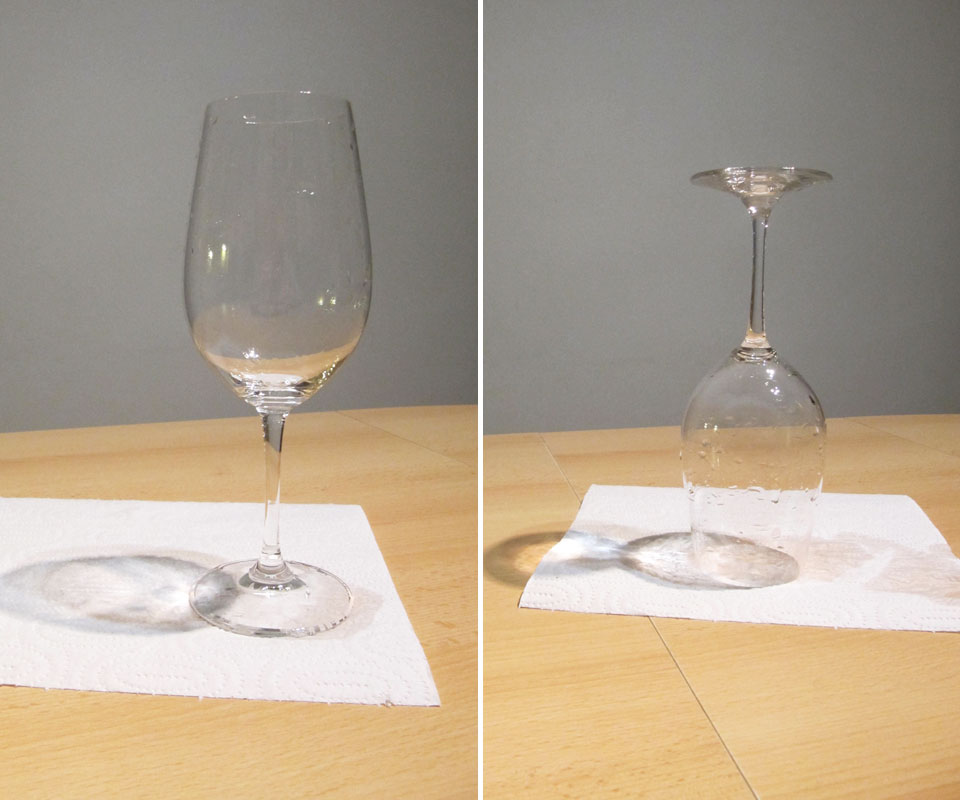 Fajn, máme umyto. Skleničku postavím na papírový ubrousek nejprve na podstavec (foto 1 vlevo). Počkám, až voda steče, z kalichu ji vyliju do umyvadla a postavím ji na chvíli obráceně (foto 1 vpravo). Sklo vám nesmí začít usychat, protože jinak začne vytvářet „mapy“ ze solí a vy budete muset mýt znovu. Stačí, řekněme, dvě minuty na podstavci a dvě minuty na kalichu.
