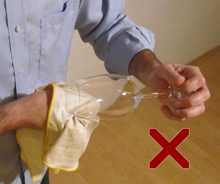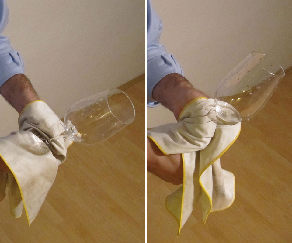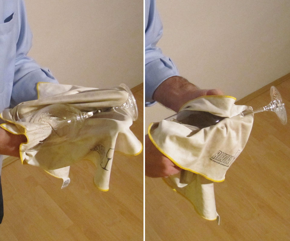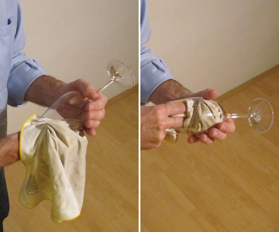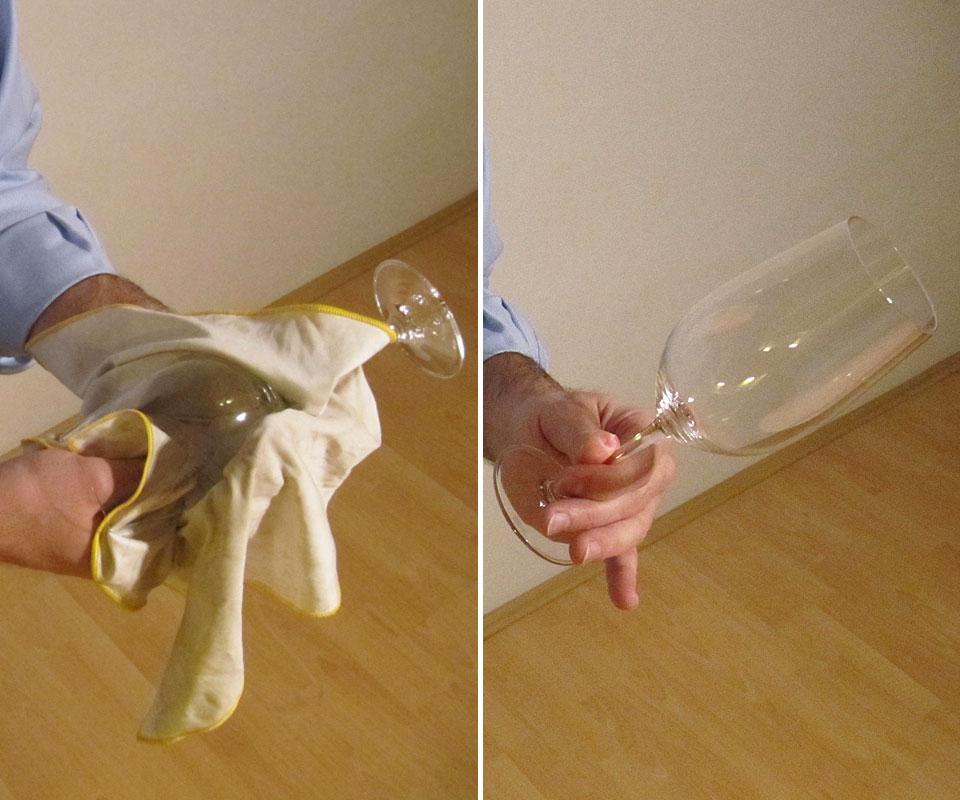 Začínám utírat. Na utírání používám látku, která nezanechává na sklenici chloupky. Před spoustou let jsem řešil, kde ji sehnat, protože většina byla nevyhovující. Stará bílá prostěradla od babičky účel splnila. Později jsem si ale koupil utěrku z mikrovlákna od Riedel a nedám na ni dopustit. Používám ji už skoro deset let a pořád svůj účel plní.