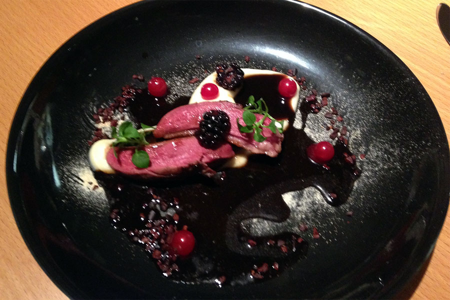 Jako předkrm jsme mimo jiné zvolili pečeného holuba z Anjou, který byl výtečně a netradičně dochucen (ovoce + drcené kakaové boby). Jako hlavní chod nás zaujala kachna, jednalo se o různé kousky kachny umně spojené do jedné teriny, podáváno s houbovou omáčkou a různě upravenými vnitřnostmi. Tento chod mě hodně zaujal, a dal bych si ho určitě znovu.