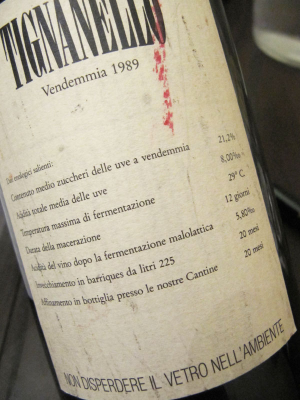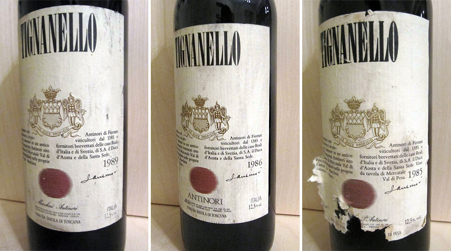 Tignanello, IGT, 1986Hodně nazrálé víno, ve vůni až do tlejícího listí a hlíny, s podtextem ovoce (červená jablka), a tóny připálené chlebové kůrky, čaje, bylinek a sudu. Je velmi dobře postavené, šťavnaté a stále celkem srovnané, v těle střední, s jemnými hladkými taniny a delší perzistencí. Víno je, byť za vrcholem, stále dobře pitelné, ale spíše jako studijní materiál pro vinné nadšence než zábavný průvodce večerem.