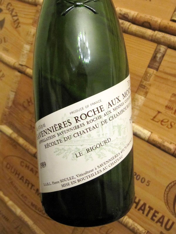 Château de Chamboureau, Savennières Roche aux Moines „Le Rigourd“, AOC, 1989 je příkladem nazrálého vína z Roche aux Moines, které na degustaci přinesl ze svého sklepa jeden z hostů. Od vůně plné, intenzivní, komplexně nazrálé, minerálně-ovocné (marmeláda z meruněk a manga, hruškové chutney, kandované meruňky a citrusová kůra), dotek medu. Má pevnou a přesnou strukturu, je šťavnaté, velmi plné, komplexní, dokonale harmonické, s dlouhou perzistencí. Víno na vrcholu, na kterém ještě pár let vydrží. Přesně proto se na tato vína vyplatí počkat.