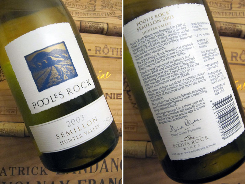 Poole’s Rock, Semillon, 2003 (foto 4)Ve vůni šťavnatý, poměrně plný a elegantní, minerálně-ovocný (citrusy, tropické plody), s dotekem petroleje (mate ryzlinkovostí) a mléčného karamelu. Chuť dokonale navazuje. Má pevnou a přesnou strukturu, je harmonický, lehce nazrálý, s plnějším tělem a extrémně dlouhou perzistencí. Objev. Vynikající víno, třináctiletý Semillon, který svádí. Blíží se své lahvové zralosti, ale má před sebou ještě dost času. Jo, a má hodně nadprůměrných 13,5 % alkoholu. V té struktuře se ale snadno skryjí.