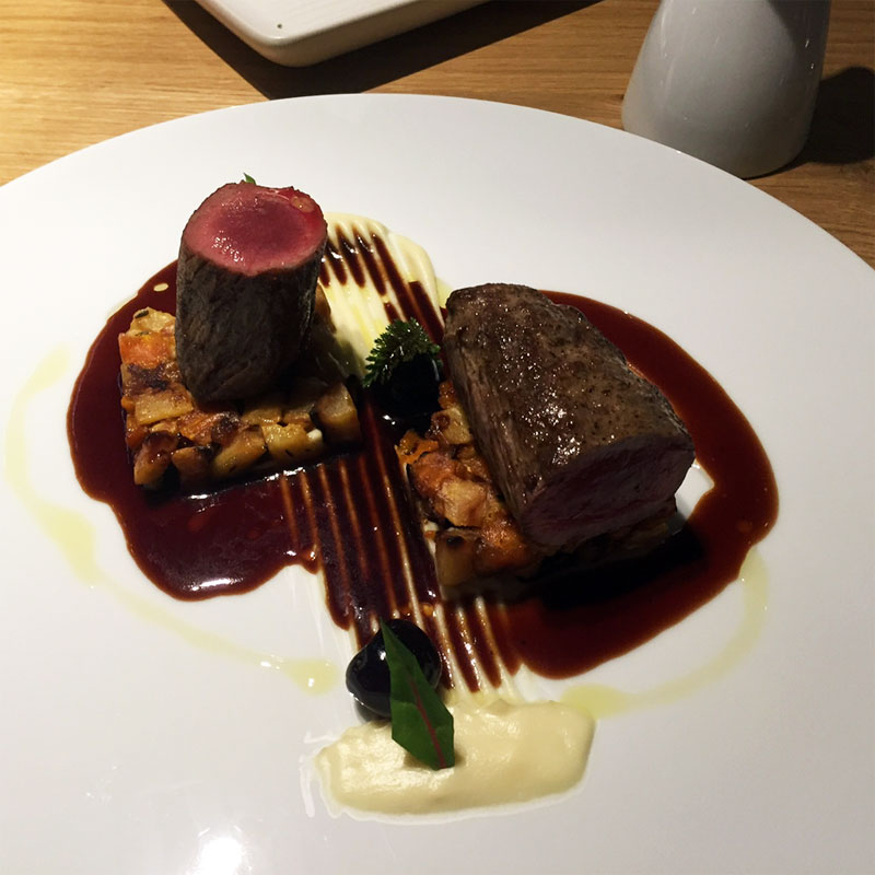 Co nás z hlavních chodů nadchlo nejvíce, byl „Srnčí filet, pečená zelenina, celerové pyré, omáčka s višněmi Amarena“. Takto dobrou a výtečně připravenou zvěřinu jsem snad u nás ještě nejedl. Zkoušeli jsme různé kombinace vín, osvědčily se třeba červené burgundské, italské Chianti či Hermitage rouge. Zvláště višně dodávají celému pokrmu šmrnc a energii.