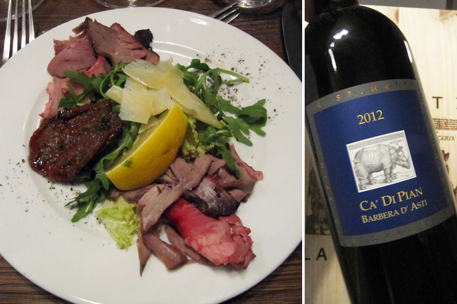 Za studena podáváná šťavnatá krkovice z divočáka se sušenými nakládanými rajčaty a hoblinkami 18 měsíčního sýra Pecorino (foto 4 a)a La Spinetta, Barbera d’Asti „Ca di Pian“, DOC, 2012 (foto 4 b)Barbera je ve vůni plná a jemná, vyvážená, minerálně-ovocná (višně, černé třešně, moruše). Chuť navazuje. Víno je velmi dobře strukturované, šťavnaté a až na mírně vyšší alkohol harmonické, má plnější tělo, sametově hladké taniny a delší perzistenci.