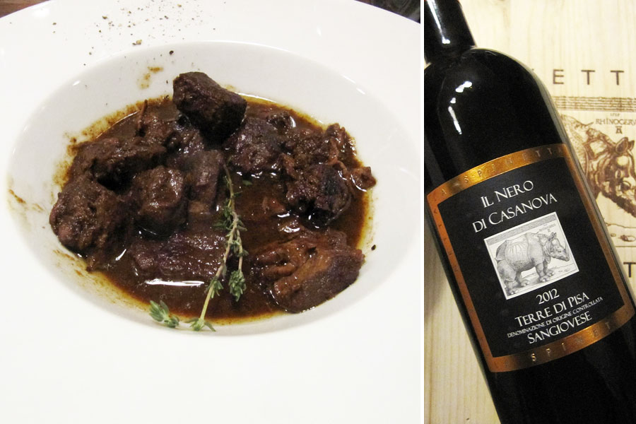 Ragout z divočáka podávaný s bagetkou (foto 5 a)a La Spinetta, Il Nero di Casanova, DOC, 2012 (foto 5 b)Víno je od vůně šťavnaté, plnější a poměrně intenzívní, ovocné (ostružiny, višně), s dotekem sudu. Je dobře postavené a šťavnaté, má hedvábné taniny, feminní, hodně jemný průběh, střední tělo a delší perzistenci.