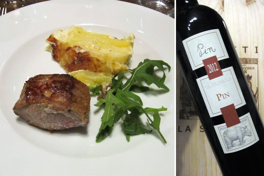 Steak ze svíčkové z divočáka marinované s lanýžem, podávaný s gratinovanými bramborami (foto 6 a)a La Spinetta, Monferrato Rosso „Pin“, DOC, 2012 (foto 6 b)Víno je od vůně neskutečně elegantní, homogenní, intenzívní a plné, minerálně-ovocné (ostružiny, višně), s tóny ušlechtilého dřeva. Má pevnou a přesnou strukturu, je šťavnaté, v těle plnější až plné, s hladkými vyzrálými ovocnými taniny a dlouhou perzistencí. Parádní cuvée tvořené ze 2/3 Nebbiolem a z 1/3 Barberou, s velkým potenciálem zrání.