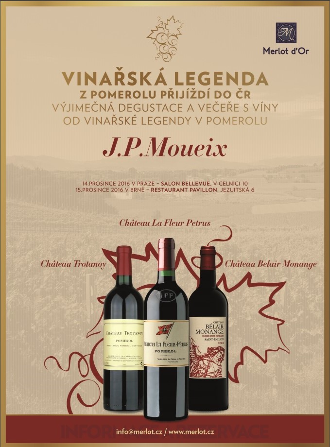 14. prosince 2016 proběhne v Salonu Bellevue v Praze unikátní večer ve společnosti vín od skutečné vinařské legendy z oblasti Pomerol v Bordeaux, Jeana Pierra Moueixe. Ikonická vína v čele s Château Trotanoy, Belair Monange a La Fleur Petrus představí exportní ředitel Stephane Laborie. Vína doprovodí šestichodové menu Zdeňka Mareše a Jaroslava Finkouse.