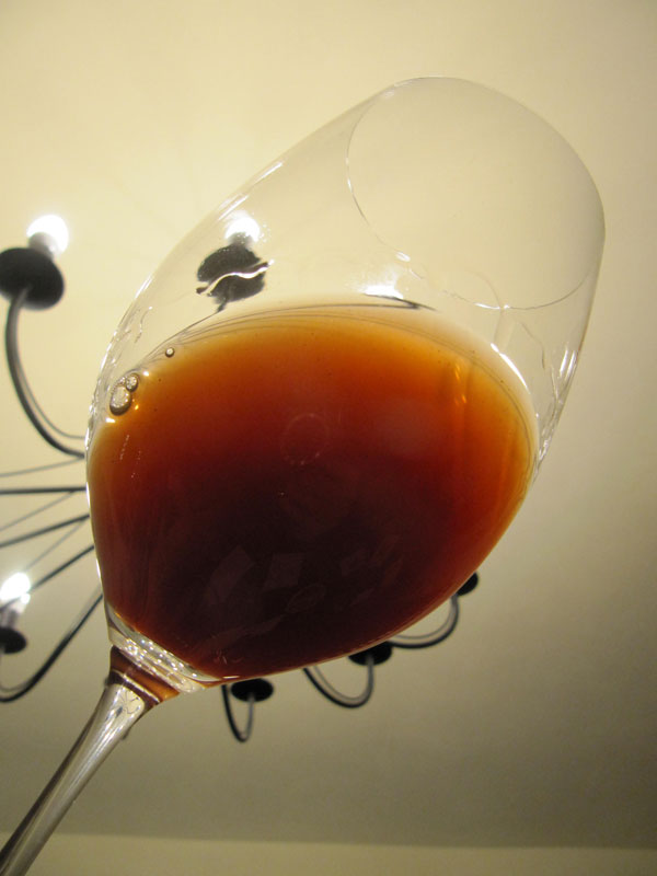 Château Musar 1991 (foto 4b)Vůně je hodně nazrálá, lehce naoxidovaná, plnější a poměrně intenzívní směsice vlašských ořechů, bylinek, medu a tureckého medu. Chuť navazuje, přidává se marmeláda z červeného a bílého rybízu. Víno má stále pevnou a přesnou strukturu, je hodně šťavnaté a srovnané, má jemné hladké taniny, střední tělo a delší až dlouhou perzistenci. Je určitě za vrcholem (horší ročník), ale pořád výborně drží a baví. Láhev ve dvou bych si rád užil. A i ten pohled na jeho barvu je krásný (foto 5).
