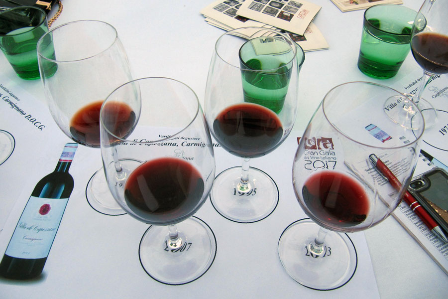 Součástí přehlídky byly rovněž tři vertikální degustace, z nichž jsem pro sebe vybral tu poslední: Tenuta di Capezzana, Villa di Capezzana Carmignano (80 % Sangiovese, 20 % Cabernet). Na programu byla čtyři vína v ročnících 2013, 2007, 1995 a 1974 (foto 8).