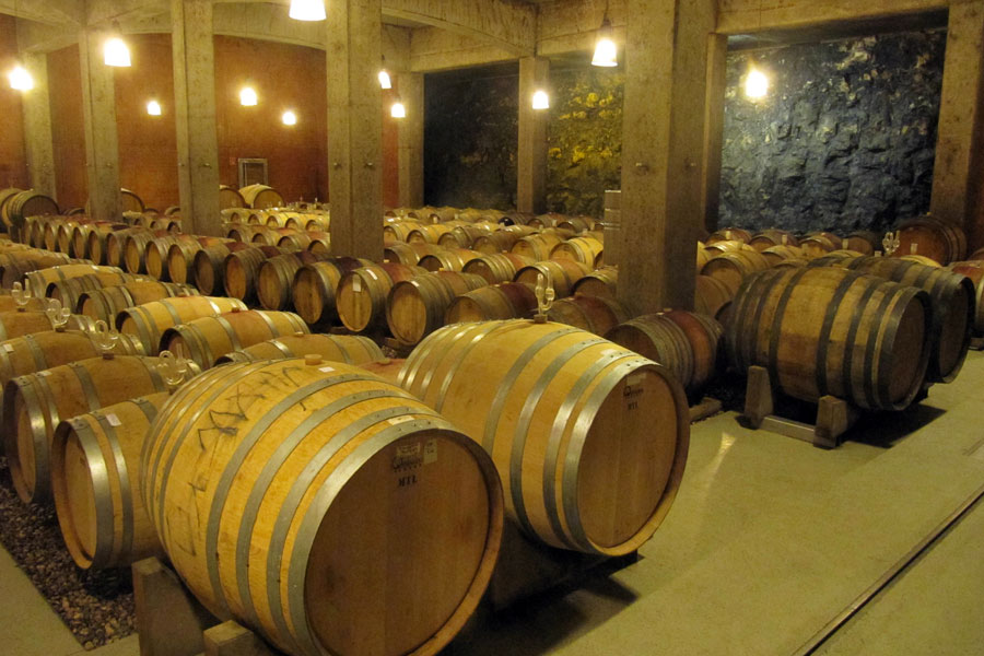 Weingut Tement je na pohled vinařství ryze moderní (foto 1) a je vidět, že tady rozhodně nic nešili horkou jehlou. Od foyer (foto 2) s terasou s geniálním výhledem na část vinice Zierreg (foto 3) a kopce na Slovinských hranicích přes vstupní místnosti pro příjem hroznů, rozmístění tanků, sudů (foto 4) a vlastně rozložení celého sklepa (foto 5) až po expedici má jasnou myšlenku. Na poslední fotce si povšimněte tmavého pozadí za sudy. Je to nezakrytá vápencová půda se zbytkami ulit…