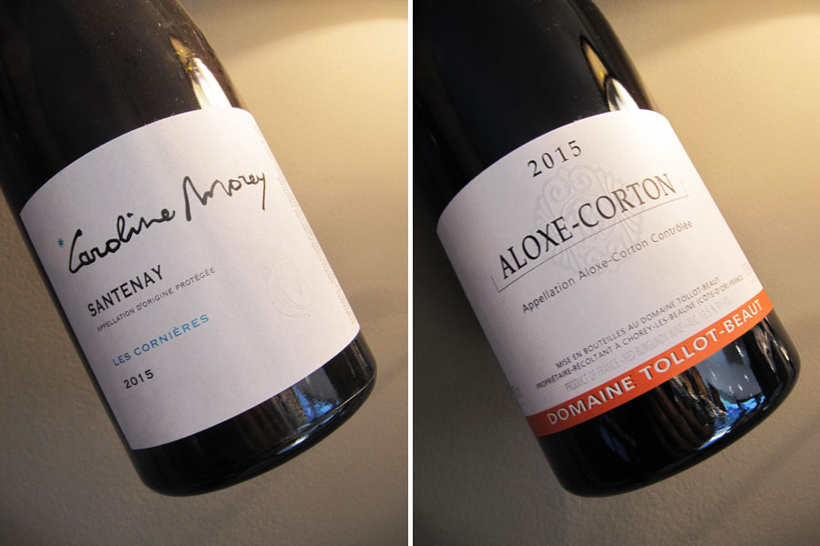 Největším pozitivním překvapením tady bylo víno od Caroline Morey, manželky mága z Chassagne Pierra-Yvese. Její Santenay „Les Cornieres“ 2015 (foto 4a) je elegantně vybalancovaná ženská záležitost, která prostě chytí za srdce. Moc se mi líbil také Aloxe-Corton 2015 od Tollot-Beaut (foto 4b). Aloxe je poloha dávající vína poměrně štíhlá, s vysokou kyselinou, v mládí příliš hubená a nekamarádská. Toto víno mě naopak baví už takto mladé, byť čas bude určitě pracovat pro něj.