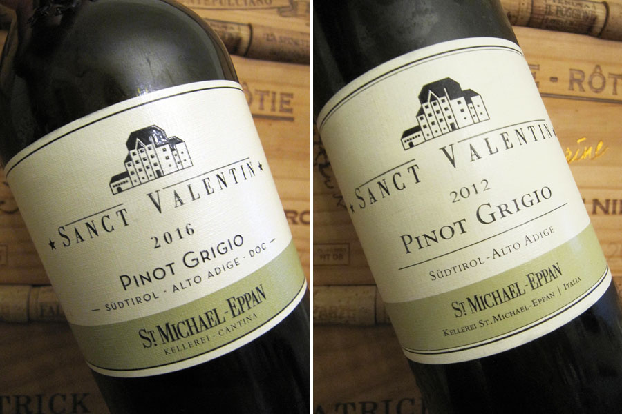 Cantina St. Michael-Eppan, Pinot Grigio, DOC, 2016 (foto 3a)Údajně jeden z nejlepších italských Pinot Grigio. Hrozny pocházejí z vinice položené 420 až 600 m. n. m. s vápenato-štěrkovým podložím a průměrným stářím keřů téměř 25 let. Vynikající ročník. Víno prošlo malolaktikou a zrálo 12 měsíců na kalech částečně v nových tonneau a částečně v nerezu. Vůně je plná, vyvážená a poměrně intenzívní, minerálně-ovocná (žluté plody, citrusy), s výrazným mléčným karamelem. Chuť krásně navazuje. Víno je velmi dobře postavené, šťavnaté, harmonické a plné, s dobrou texturou a delší až dlouhou perzistencí. Zatím ještě mladé, s potenciálem zrání; sudu je tam na můj vkus víc, ale uvidíme, co s tím udělá čas.