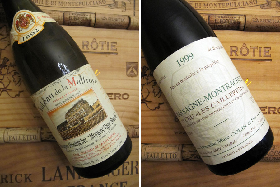 Chateau de la Maltroye, Chassagne-Montrachet 1er Cru „Morgeot Vigne Blanche“, 1992 (foto 2a)Vinařství sídlí v Chassagne-Montrachet a vlastní 14,5 ha. Ročník 1992 je průměrný a v 20 bodovém hodnocení Clivea Coatse dostal 15,5 bodu. Víno je od vůně plné, intenzívní a nazrálé, ale bohužel jej provází nepříjemná zatuchlina, která všechny ty tóny přezrálých nektarinek, manga, citrusů, mintu, bylin, slámy a minerality nepříjemně ruší. To zamrzí, protože jinak má to víno neskutečnou strukturu a plnost, a zároveň šťavnatost, eleganci a dlouhou perzistenci. Snad je to jen chyba jedné lahve.