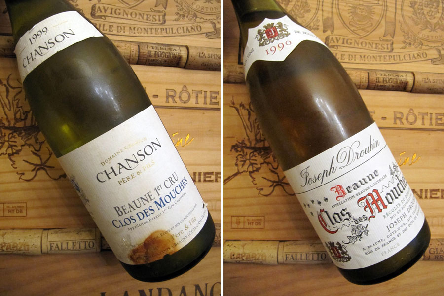 Domaine Chanson, Beaune 1er Cru „Clos des Mouches, 1999 (foto 5a)Vinařství sídlící v Beaune, vlastní 43 ha vinic, ale funguje také jako négociant. Od roku 1999 patří Bollingeru. Vinohrad „Clos de Mouches“ má ambice stát se Grand Cru. Má rozlohu 25 ha a leží na hranici s Pommard. Víno je od vůně hodně mladé, jemné a ženské, s bílými květy, minerálně-ovocné (bílé plody, bílý meloun, citrusy), s tóny mandlí a citelnou slaností. Chuť dokonale navazuje. Víno má pevnou a přesnou strukturu, je elegantní, harmonické, s jemnou texturou, dlouhou perzistencí a dlouhým potenciálem zrání. Nikdo by mu nehádal více než 10 let. Skvělé.