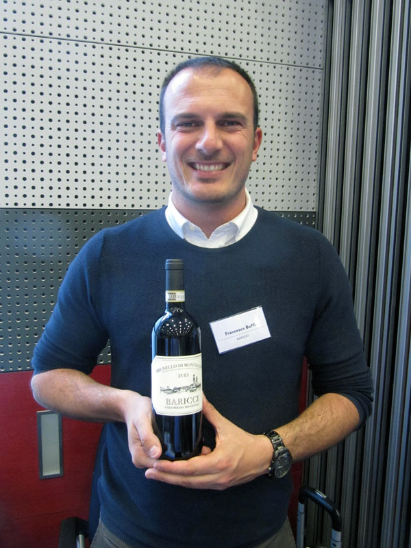 Vína historického vinařství Fattoria dei Barbi na mě tentokrát působila trochu odtažitě a nepřístrupně, a to včetně vrcholného Brunello di Montalcino „Vigna del Fiore“ 2012. Naopak mě velmi mile překvapilo Rosso di Montalcino 2016 i Brunello di Montalcino 2013 od další novinky v portfoliu VinoDoc, rodinného vinařství Baricci. Jeden z majitelů, obrovský sympaťák Francesco Buffi (foto 6), zmínil, že vinařství Baricci je na mapě Montalcina označeno historickým číslem 1!