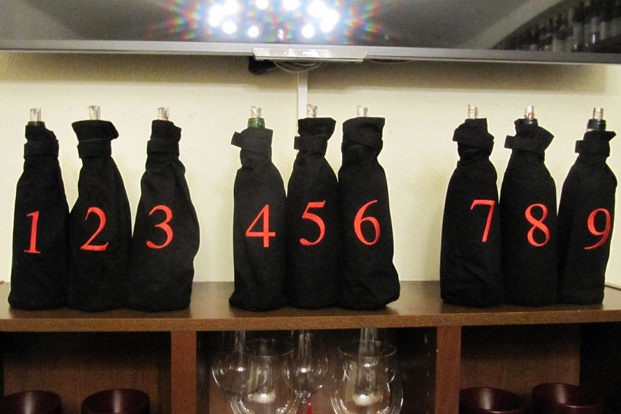 Záměr je jasný. Zjistit, jak se po otevření chovají různé typy vín v čase. Vína jen otevřeme a neodléváme. Volba padá na taková, která ještě nedosáhla lahvové zralosti a jsou světovými kritiky hodnocena nad 90 bodů. Degustujeme naslepo (foto 1) a posléze diskutujeme vjemy z nich ve skupince osmi lidí, z nichž pět studuje WSET Level Diploma.