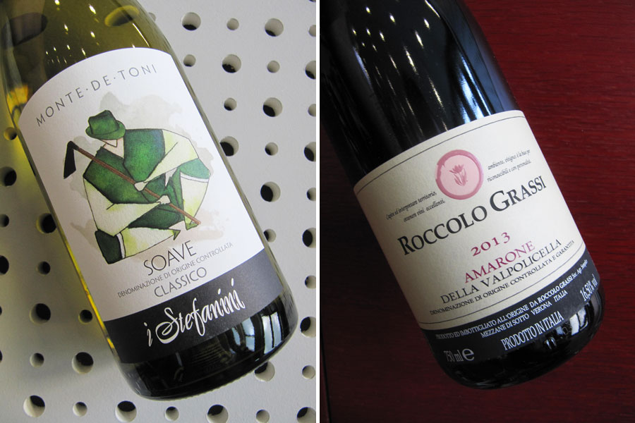 Tady mě zaujalo srovnání dvou Soave. První, od vinařství I Stefanini, se jmenuje Soave Classico „Monte de Toni“ DOC 2017 (foto 3b) a pochází ze 70letých keřů rostoucích na vulkanických půdách. Má zajímavý minerální a hlavně kouřový podtext (přestože je vinifikováno na inoxu) a potřebuje ještě zrát. To druhé je od vinařství Roccolo Grassi, Soave „La Broia“ DOC 2016 (foto 4a), je z vápenatých půd a aktuálně je mnohem lépe pitelné, s podmanivou citrusovou linkou a citelnou slaností. Od stejného vínařství tu byla taky parádní a elegantní Valpolicella Superiore DOC 2013 a úžasné plné Amarone DOCG 2013 (foto 4b) s tóny bylinných extraktů, pocházející ze 40letých keřů.