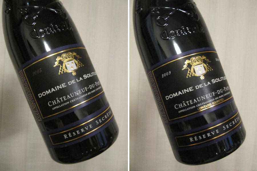 Châteauneuf du Pape „Réserve Secrète“, AOC Rouge, 2009 (foto 5b)Noblesní, jemná nazrálost, spojitost, do červených plodů + citrusy, koření, sud a extrakt z bylin. Komplexní, vyhlazené, stále s citelnými taniny a velmi dlouhou perzistencí. Nazrává úžasně a je spíše elegantní než silné.