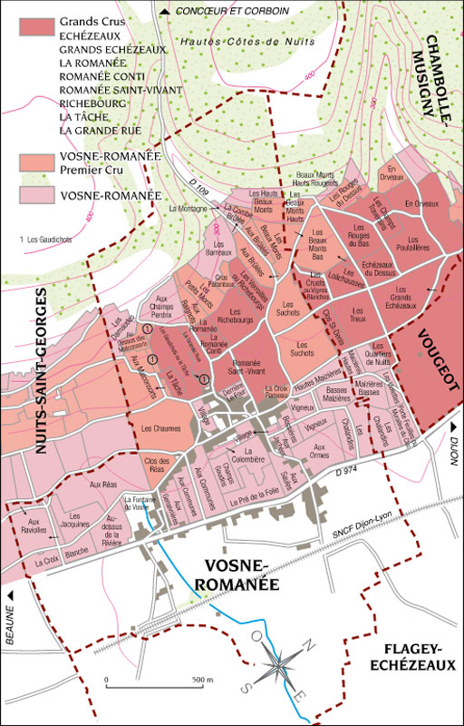 Apelace Vosne-Romanée (foto 1) se rozkládá na cca 152 ha a spadá sem osm Grand Cru pozemků, z toho šest u vesnice Vosne-Romanée: Romanée-Conti, Romanés-Saint-Vivant, La Romanée, La Tâche, La Grand Rue a Richebourg a dvě u sousední vesnice Flagey-Échezeaux: Échezeaux a Grands-Échezeaux. A nezapomeňme ani na 14 špičkových Premier Cru.