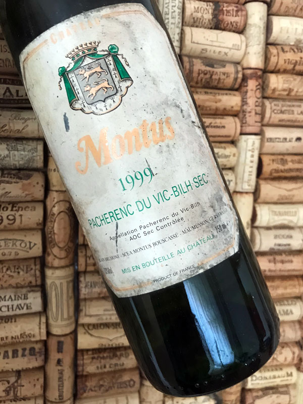 Château Montus, Pacherenc du Vic-Bilh Sec, AOC, 1999 (foto 1)Cuvée z 80 % Petit Courbu a 20 % Gros Manseng, zrálo cca 12 měsíců v 600litrových dubových sudech.
