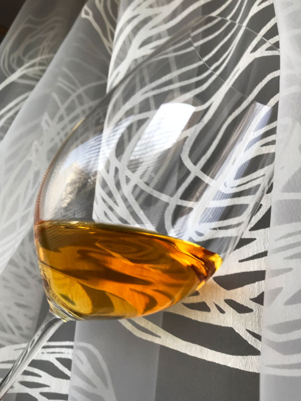 Víno je už od barvy nazrálé a v paprscích slunce vypadá jako leštěný jantar (foto 2). Chuť je také nazrálá, elegantní a podmanivá, opulentní, intenzívní a zároveň svěží a vyvážená, minerálně-ovocná (přezrálé mirabelky, kandovaná mandarinková kůra, tropické plody) s tóny medu, oříšků a bylinek a taky dotekem mintu, vanilky a ušlechtilého dřeva. Chuť navazuje, přidává se kompotovaná mandarinková šťáva. Víno má pevnou a přesnou strukturu, je úchvatně šťavnaté, spojité a komplexní, v dokonalé kondici a harmonii všech složek, má nevídanou pitelnost (podobně jako nazrálé ryzlinky z Mosely), plné tělo, hladký projev a dlouhou perzistenci s jemnou osvěžující grepovou hořčinkou v dochuti.