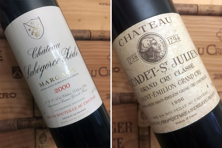 Château Lageborce Zede, AOC, 2000 (Margaux, Francie), (foto 1 a)Víno z dnes již neexistujícího vinařství začleněného do dnešního Château Lageborce. Většina Cabernet Sauvignon plus Merlot a trocha Petit Verdot. Špičkový ročník, Robert Parker (dále jen RP) 94 bodů. Vůně je plnější, poměrně intenzívní, srovnaná, lehce nazrálá a animální, minerálně-ovocná (černý rybíz, ostružiny), s tóny koření a výrazným francouzským barikem. Chuť navazuje, dominuje jí dřevitost. Víno je velmi dobře postavené, šťavnaté a vyvážené, v těle střední až mírně plnější, s výraznými vyzrálými taniny plus další spoustou taninů ze sudu, a střední až delší perzistencí. Za mě kategorie „víc dřeva než vína“. Škoda.