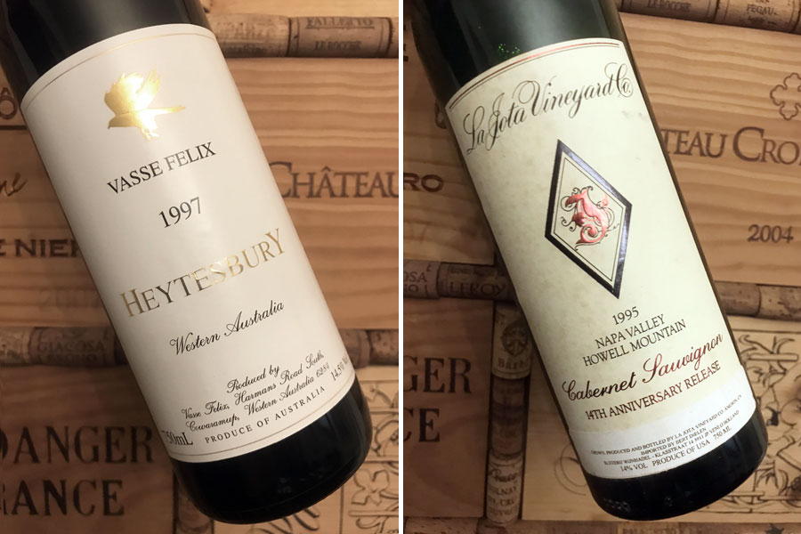La Jota, Cabernet Sauvignon „14th Anniversary Release“, 1995 (Kalifornie, USA), (foto 3 b)Vinařství založeno v roce 1898 v Howell Mountains v Napě, znovuobnoveno v roce 1974, dnes 11 ha. Vinohrady až 700 mnm, cuvée Cabernetu, Merlotu a Francu, vynikající ročník (RP 94). Vůně je jemná, elegantní, nazrálá a vyvážená, minerálně-ovocná (ovocný kompot z tmavých plodů), s podtextem sudu. Chuť dokonale navazuje. Víno má pevnou a přesnou strukturu, je jemné a šťavnaté, až na lehce vyšší alkohol srovnané, v těle plnější, má výrazné vyzrálé ovocné taniny a delší až dlouhou dochuť. Krásná ukázka vína z Napy, když dostane prostor nazrát do vrcholné formy.