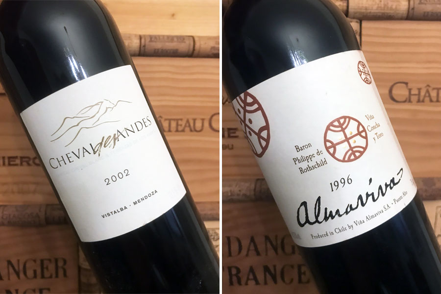 Baron Phillippe de Rothschild & Vina Concha y Toro, Almaviva, 1996 (Chile), (foto 4 b)Společný podnik Baron Phillippe de Rothschild a Vina Concha y Toro iniciovaný v roce 1997, 60 ha Almaviva – 650 mnm, nejstarší vinohrad z roku 1978. Cuvée 75 % Cabernetu, 19 % Carmenere a 4 % Caberent Franc, 16 měsíců ve francouzských baricích. Úplně první vyrobený ročník! Vůně je komplexní, nazrálá a ve všech směrech podmanivá, plná, intenzívní a vyvážená, minerálně-ovocná (směs tmavých plodů), s troškou koření a výrazným rámem ušlechtilého dřeva. Chuť dokonale navazuje. Víno má pevnou a přesnou strukturu, je příjemně šťavnaté a elegantní, působí až neskutečně mladě, silně a opojně. V těle plnější, harmonické, s výraznými vyzrálými ovocnými taniny a dlouhou perzistencí. Velké víno s velkou budoucností.