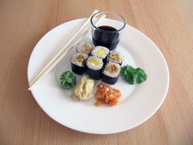 Sushi s mangem nebo smaženou krevetou (foto 4)Obě vína jsou s mangem super, chutě se spojují a vytvářejí obohacující chuťové vjemy. Sushi se smaženou krevetou ustojí jen Weinbach, a je to překvapivě hodně zajímavá kombinace. Wolfbergera tempura přebije.