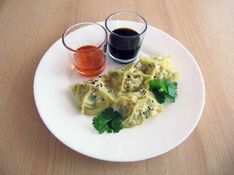 Thajské WON TON knedlíčky s krevetami, chilli olej a soya sauce (foto 5)Obě vína výborně fungují se sójovou omáčkou. Spojení sladkosti a slanosti funguje skvěle. S chilli olejem je to složitější. Vína zpočátku olej válcují, pak zase chilli je. Hmm. S chilli olejem určitě ne.