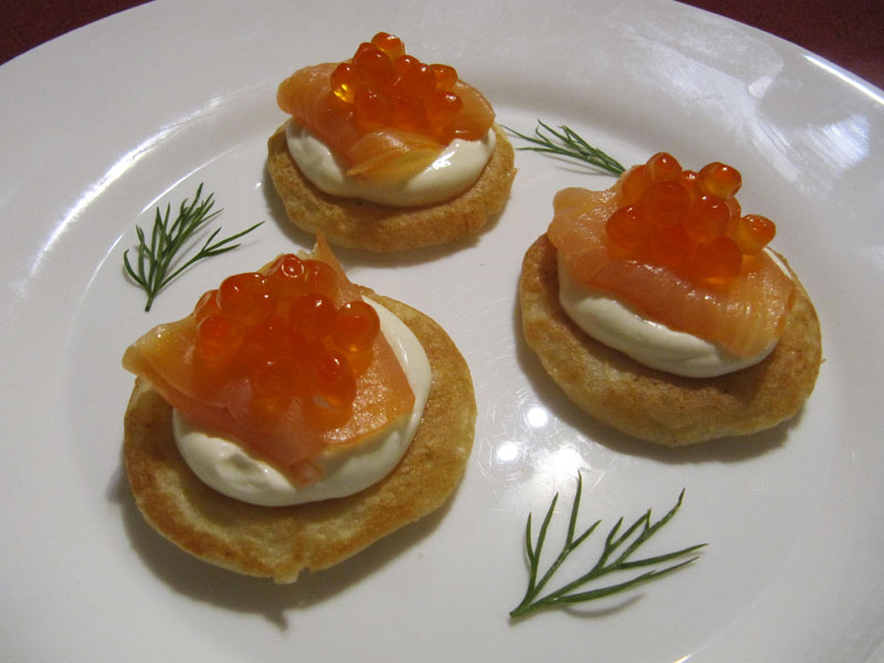 Bliny s uzeným lososem a kaviárem, créme fraiche (foto 4)Péters: Super match se vším všudy, spojení dvou duší. Paillard: Zajímavé spojení, jako tanec jin a jang, proplétání těl, dvě individuality při společném tanci. Lenoble: Rozházené, kaviár a kávové tóny vína se míjejí.