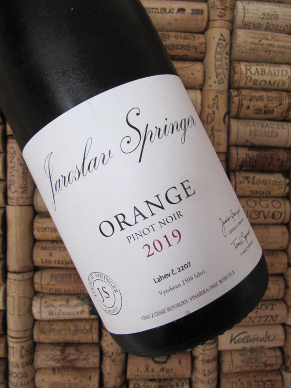 Jaroslav Springer, Orange, 2019 (foto 1)Víno je vyrobeno z odrůdy Pinot Noir a jeho vůně je hodně svěží, mladá a syrová, přímá, intenzívnější a středně plná, minerálně-ovocná (pomerančová kůra, vyzrálý růžový grep), s citelnou vápenatostí a dotekem sudu. Chuť navazuje, jen jde více do grepů. Víno je velmi dobře postavené, hodně šťavnaté s výraznou kyselinou a jemnou grepovou hořčinou, srovnané, v těle plnější, a má delší perzistenci. Zatím je hodně mladé a rozvrkočené, už teď se dá po přípravě užít, ale čas na lahvi mu rozhodně prospěje nejen k lepší integraci vysoké kyseliny a lepší spojitosti.