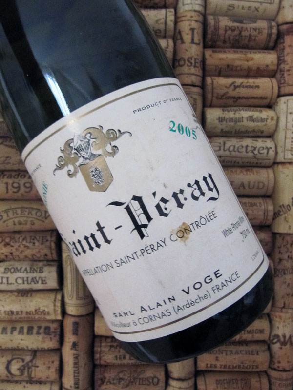 Alain Voge, Saint-Péray „Harmonie“, AOC, 2005 (foto 1)Jedná se o cuvée z vinic Le Plantier, Prieuré a Chamblard a zosobňuje odrůdu Marsanne. První ročník Harmonie vynikl v roce 2001. Keře mají v průměru 30 let, podloží je žulové a jílovito-vápenaté. Sběr probíhá samozřejmě výhradně ručně (těžko přístupné vinice na svazích), fermentace hroznů za nízkých teplot v betonových nádržích, následuje malolaktická fermentace a zrání na kalech cca 10 měsíců (rovněž v betonu). Vinařství uvádí archivační potenciál 5 let.