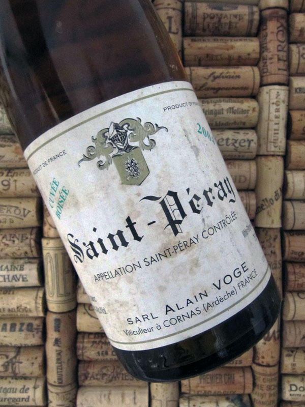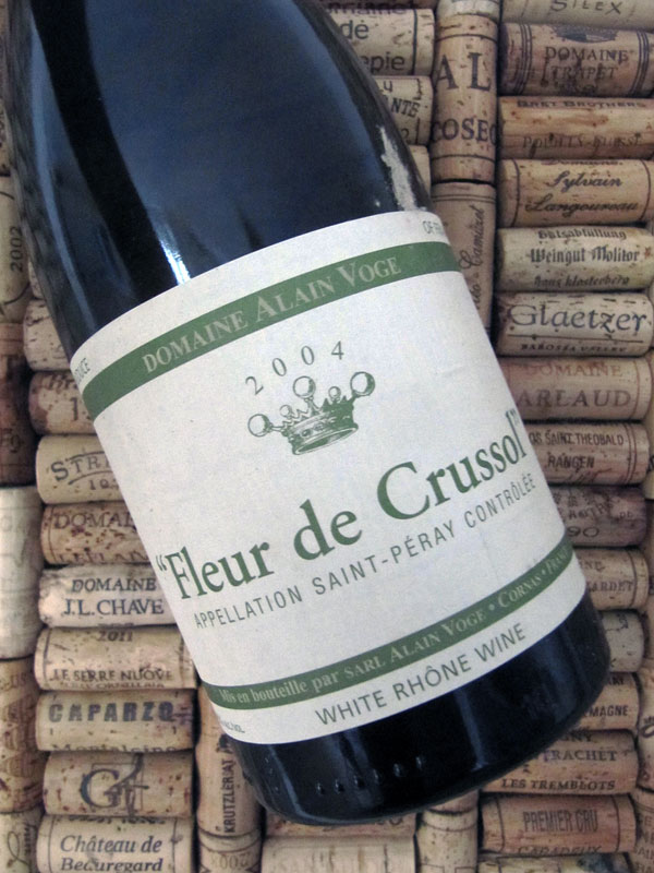 Alain Voge, Saint-Péray „Fleur de Crussol“, AOC, 2004 (foto 3)První víno bylo připraveno v roce 1999 Alainem Vogem a Lyonským sommelierem Danielem Denisem. Pochází z 1,5 ha jihovýchodně orientované polohy s 80letými keři, které jsou nejstarší v apelaci. Podloží je primárně vápencové smísené s žulovou drtí. Fermentace a zrání je stejné jako u předešlého vína, jen na kalech leží déle (16 měsíců). Uváděný potenciál zrání 10 let.