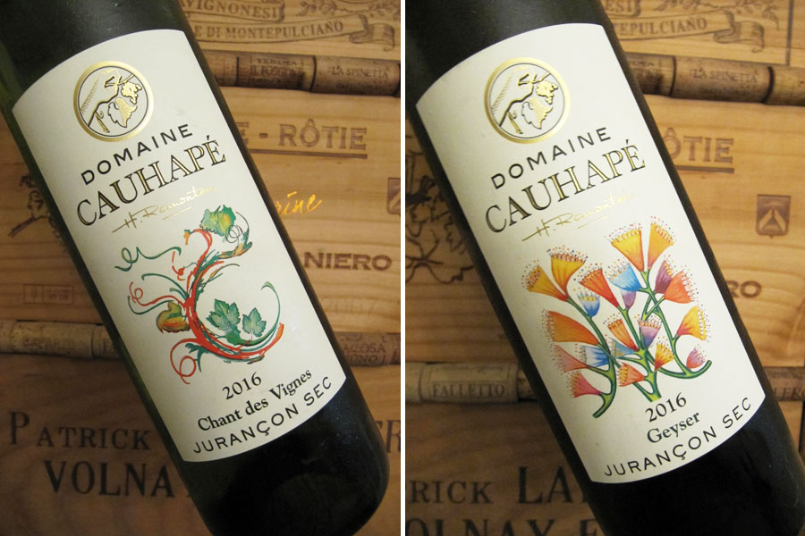 Domaine Cauhapé, Jurançon Sec „Chant des Vignes”, AOC, 2016 (foto 2a)Vůně je plná, středně intenzívní a srovnaná, se zvláštním voskovým nádechem, jinak minerálně-ovocná (bílé tropické plody, meruňky, mandle) s tóny bylin a slaměnek. Chuť navazuje, přidává se kořenitost a minerální slanost (až kamenitá). Víno je velmi dobře postavené, úžasně šťavnaté, až na lehce vyšší alkohol vyvážené a má delší až dlouhou perzistenci s hořčinkově-citrusovým závěrem. Moc hezké vyvážené víno, geniální svou přirozeností a univerzálním použitím v gastronomii (od ryb, přes sýry, saláty, bílá masa až po steak).