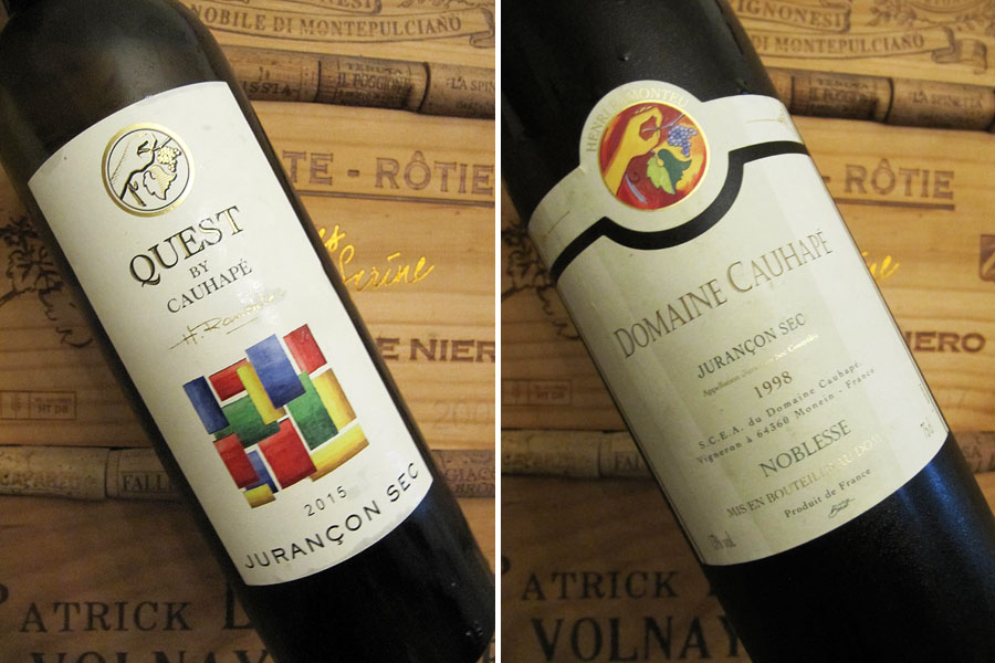 Domaine Cauhapé ,Jurançon Sec „Quest”, AOC, 2015 (foto 3a)Vůně je lehce nazrálá, plnější, intenzívnější, „teplejší“ než předešlá, srovnaná a zvláštně jemná, minerálně-ovocná (bílé a žluté tropické plody, meruňky) s náznakem medu, sušenými bylinkami a minerální slaností. Chuť navazuje, přidává se (subjektivně) ne úplně příjemná hořčinka. Víno je velmi dobře postavené, celkem šťavnaté, až na vyšší alkohol srovnané, má plné tělo a dlouhou perzistenci s hořčinkovou dochutí. Zajímavé a hezky poskládané víno, šťavnaté i ovocné, ale ta hořčinka je příliš výrazná.